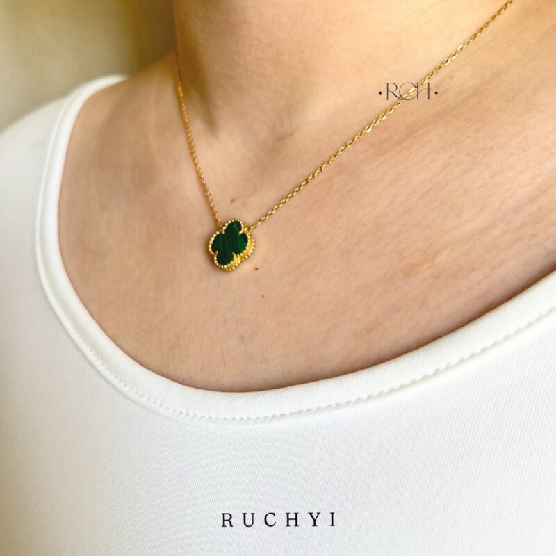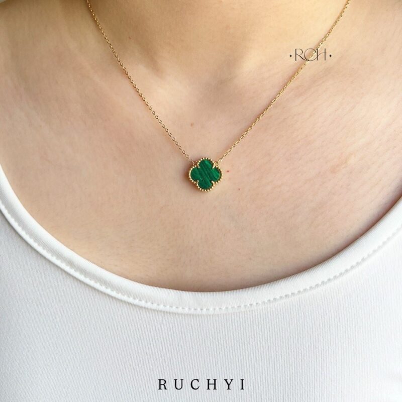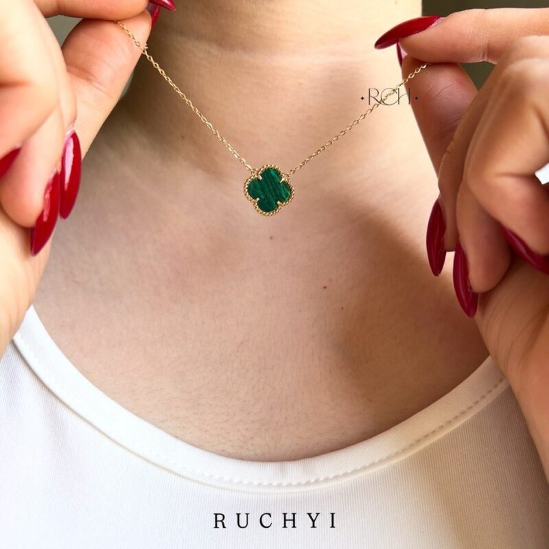 طراحی چهاربرگ ونکلیف که به نشانه خوششانسی شهرت دارد، در ترکیب با رنگ سبز، معنایی دوچندانی میگیرد؛ گویی این گردنبند هم زیباست و هم الهامبخش. زنجیر طلای ظریف و براق، جلوهای شیک و مدرن به این جواهر بخشیده و آن را مناسب استفاده روزمره و همینطور مراسم خاص کرده است.